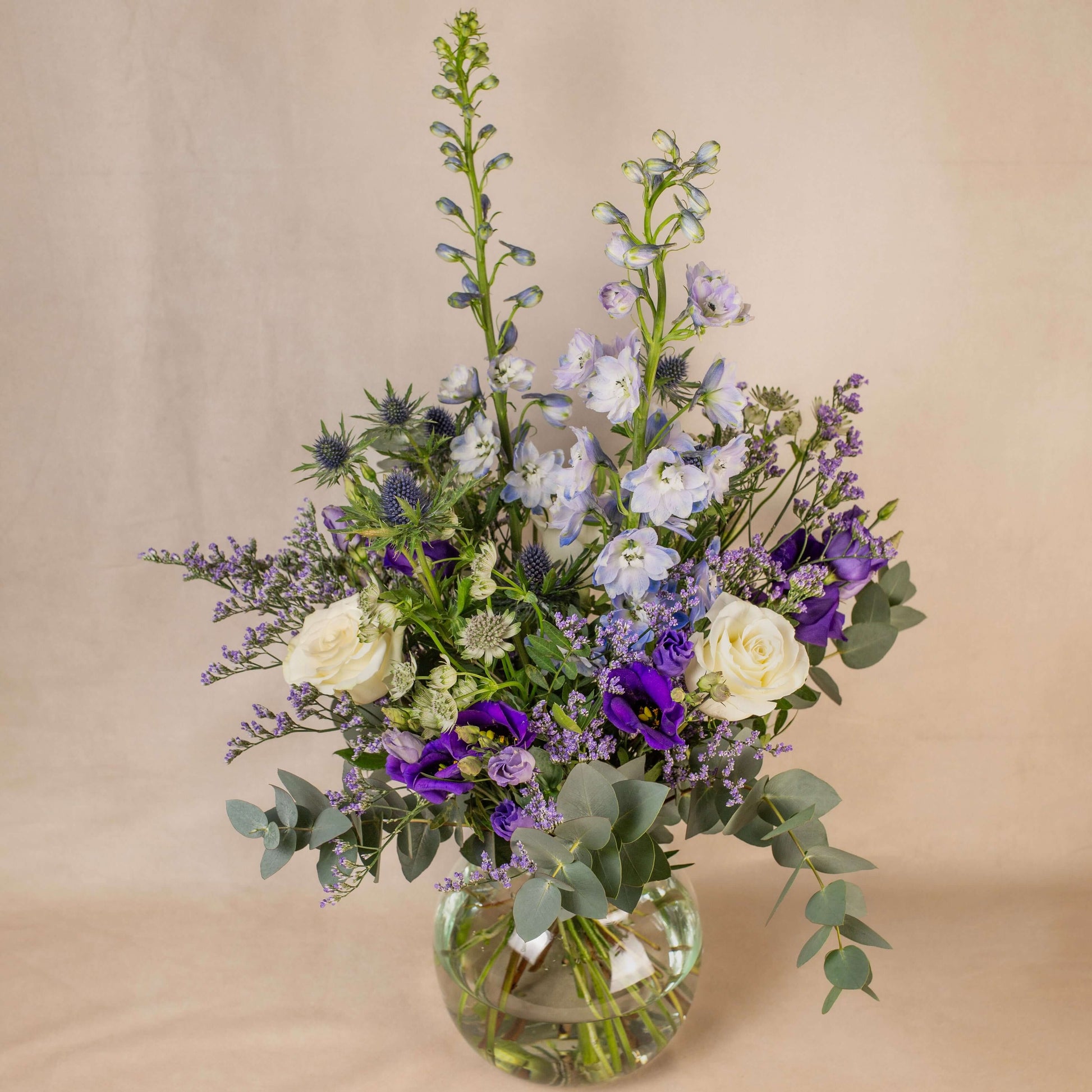 A wild Scottish mix bouquet including thistles, avalanche roses, lisianthus, wild complimenting filler flowers, and framed with fresh eucalyptus . Premium size is as shown, vase not included.