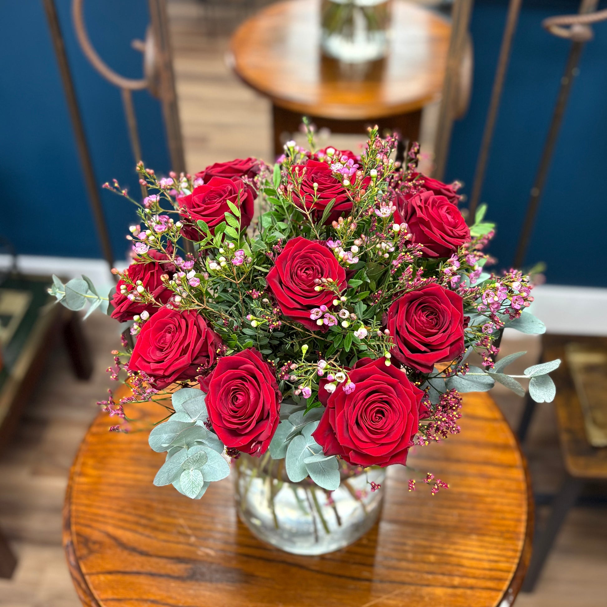 A timeless symbol of love - dozen red roses. Made exquisitely with large headed Naomi roses, seasonal filler flowers and fresh eucalyptus. Also available in half dozen. Vase not included.