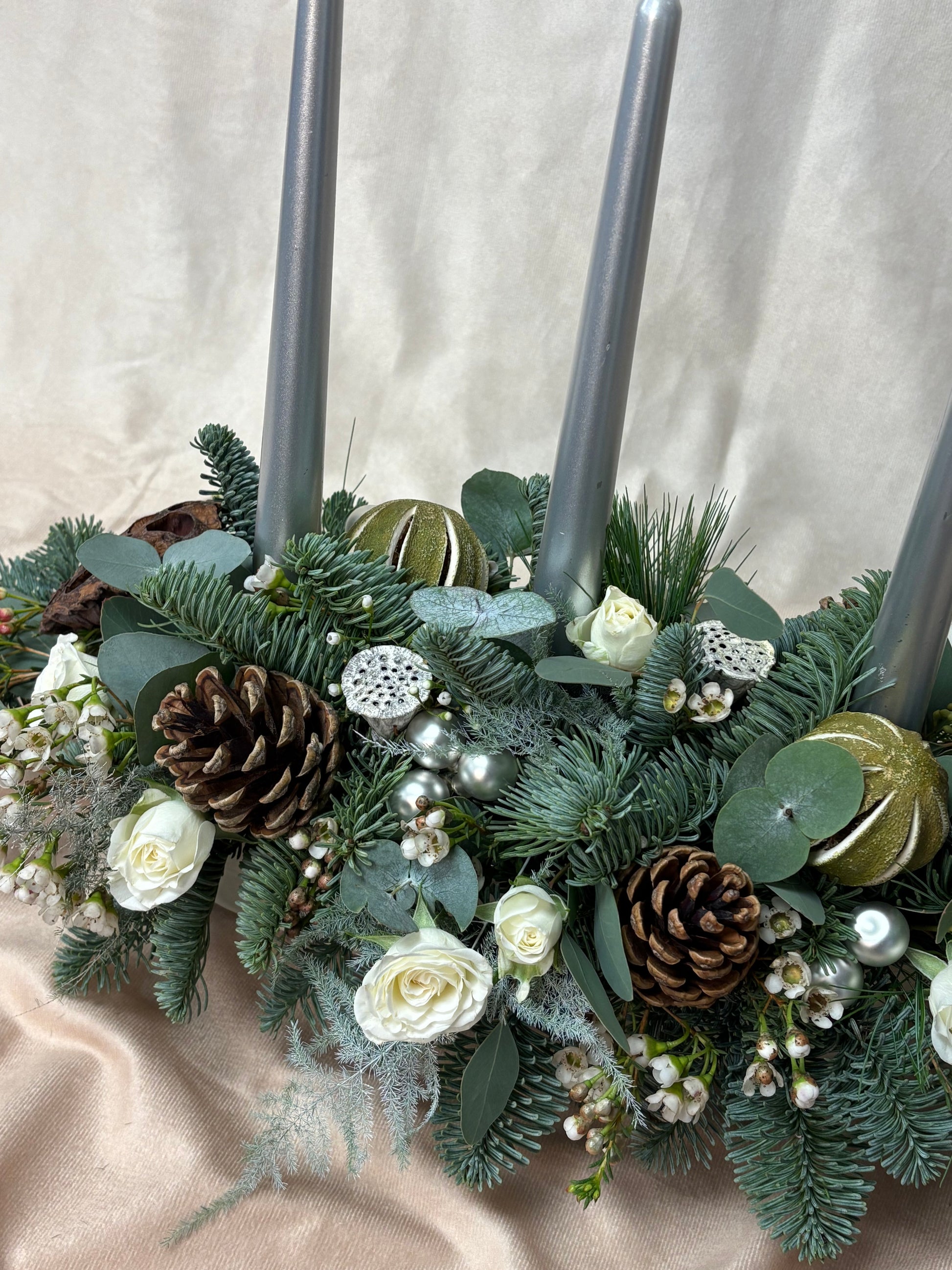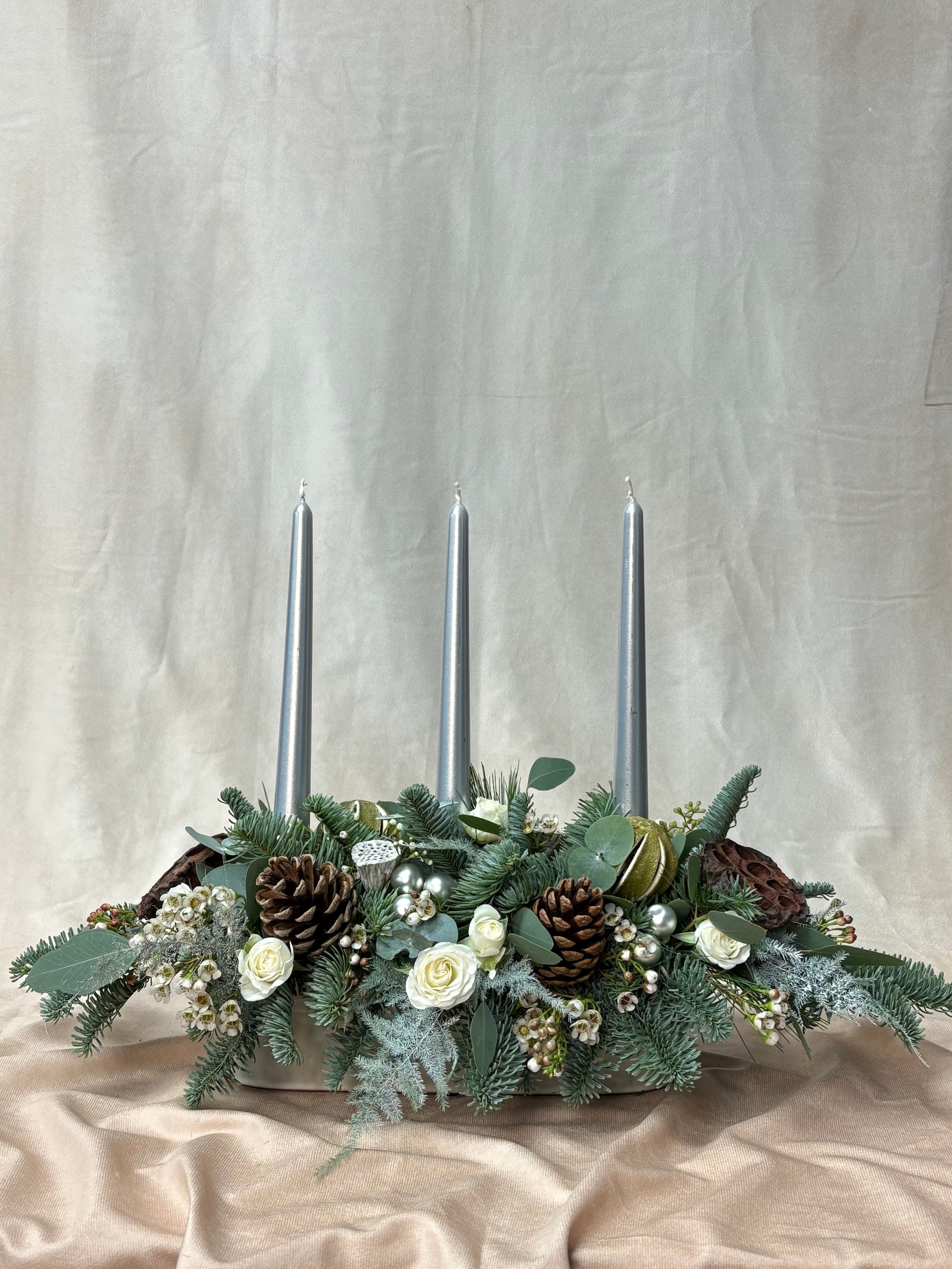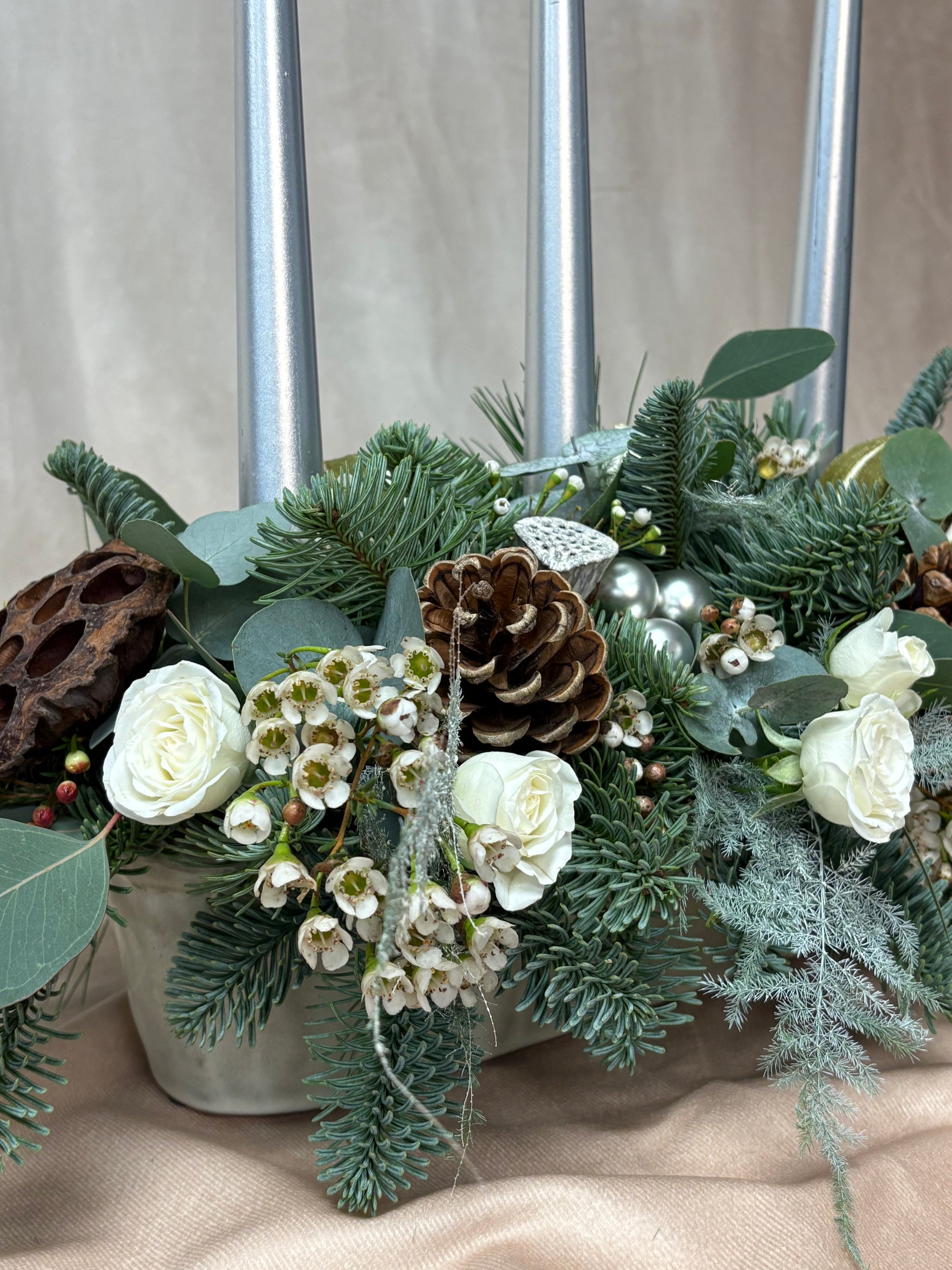 A long-lasting festive table arrangement in a gorgeous white ironstone container. Including silver taper candles and spray roses atop a bed of fragrant blue spruce, eucalyptus, berried populous, seasonal filer flowers and adornments such as baubles, pine cones and lotus heads.