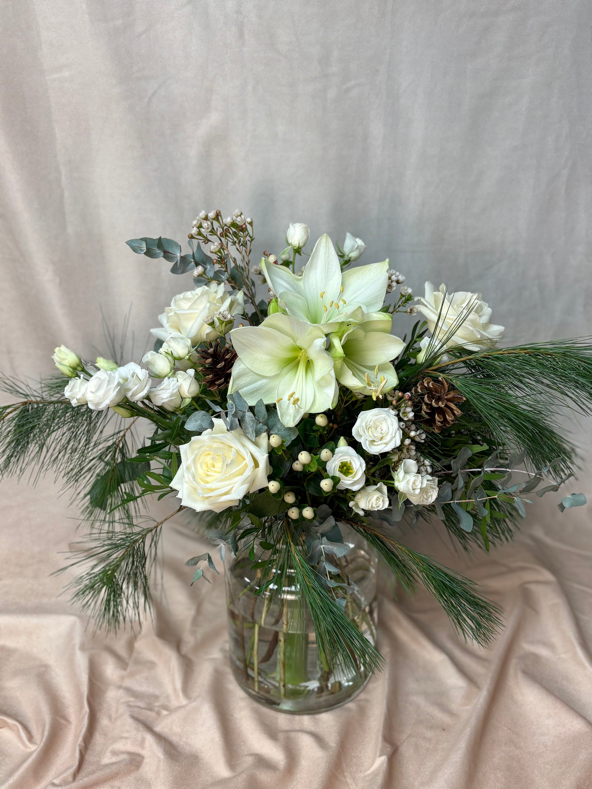 A festive Christmas hand-tied bouquet in varying whites and greens. Including fragrant pinus foliage, natural pine cones and wax flower, framed with fresh eucalyptus. Vase not included. Deluxe is as shown.