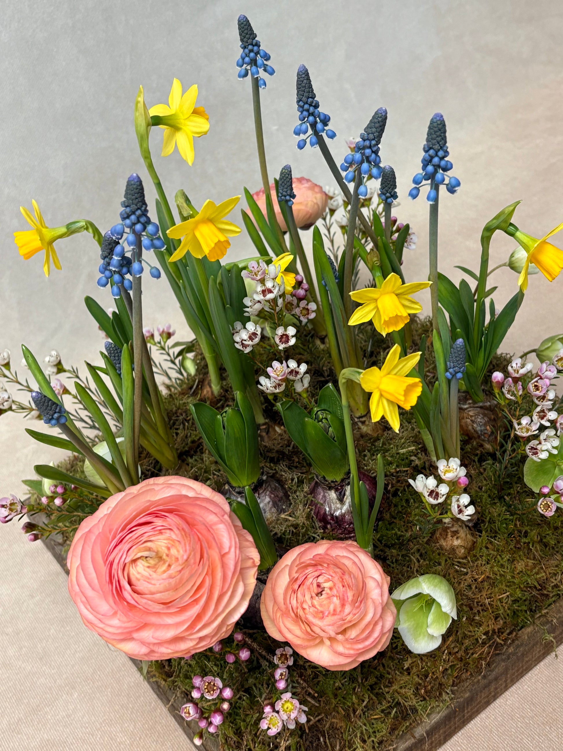The gift of a spring garden in a rustic wooden tray. Including long lasting spring bulbs such as hyacinths, muscari and tête-a-tête daffodils on a bed of moss aside wax flower, hellebores and ranunculus. The square tray measures 30cm wide & recommend to be lightly watered once a week to ensure longevity.