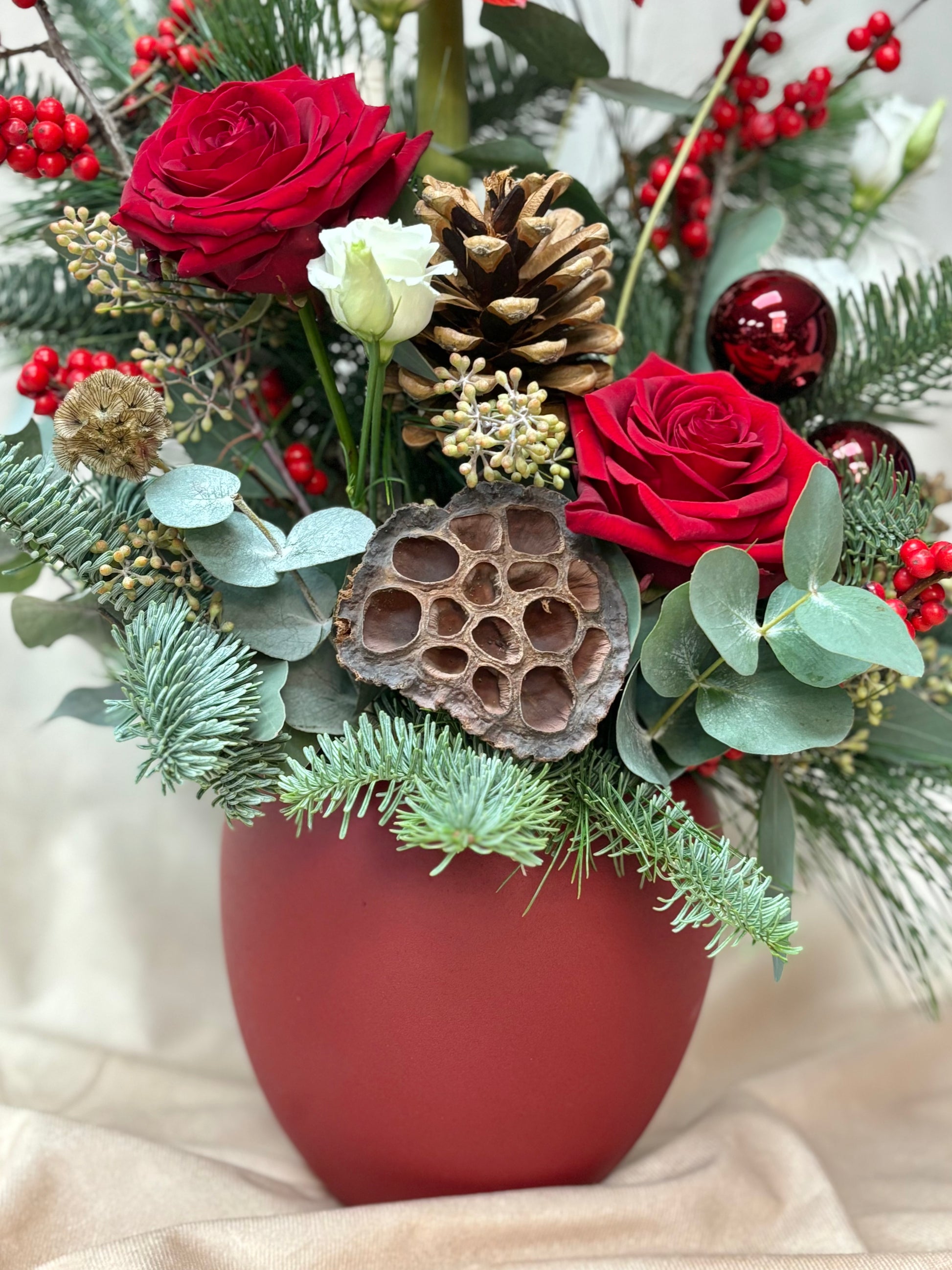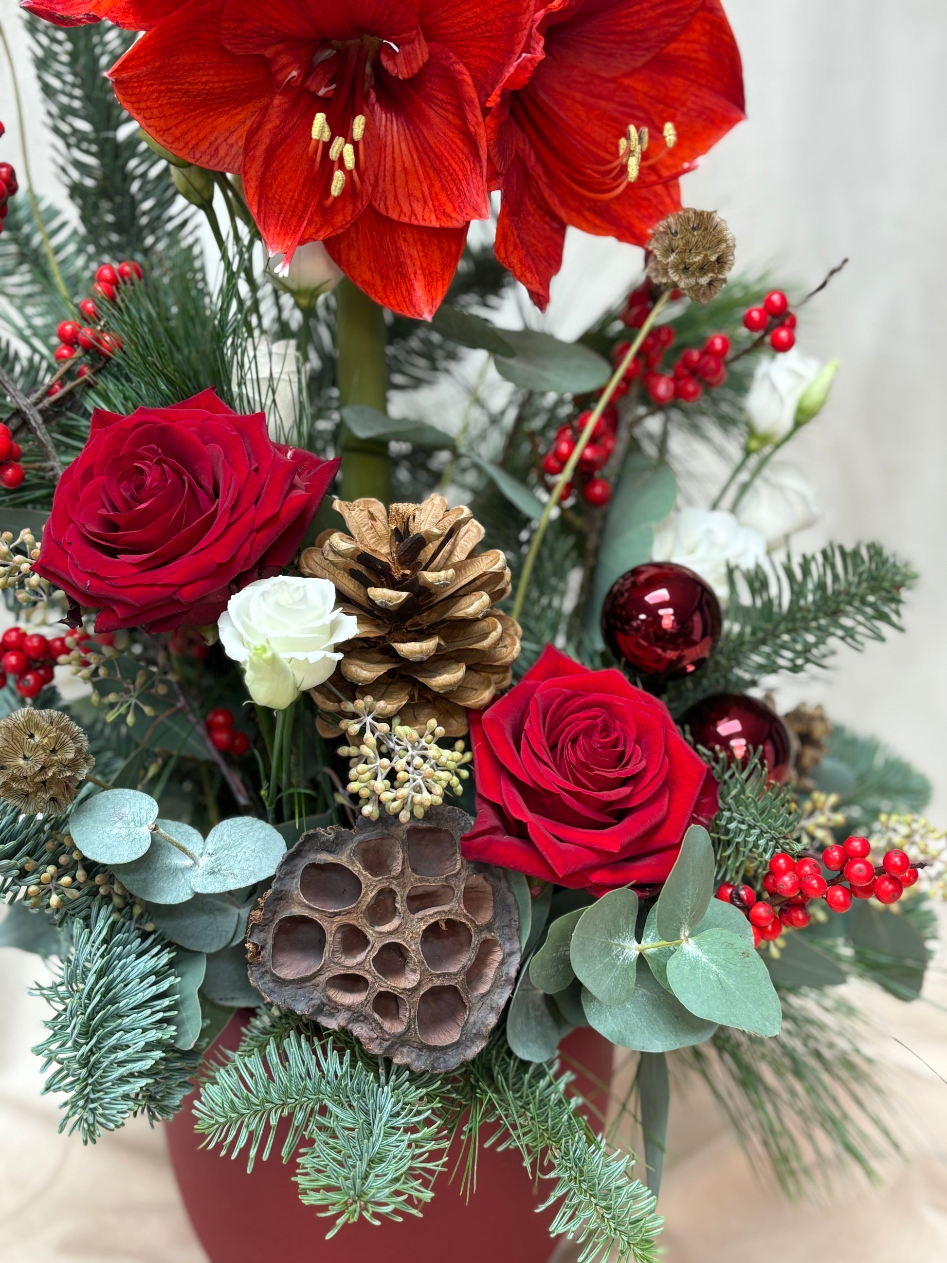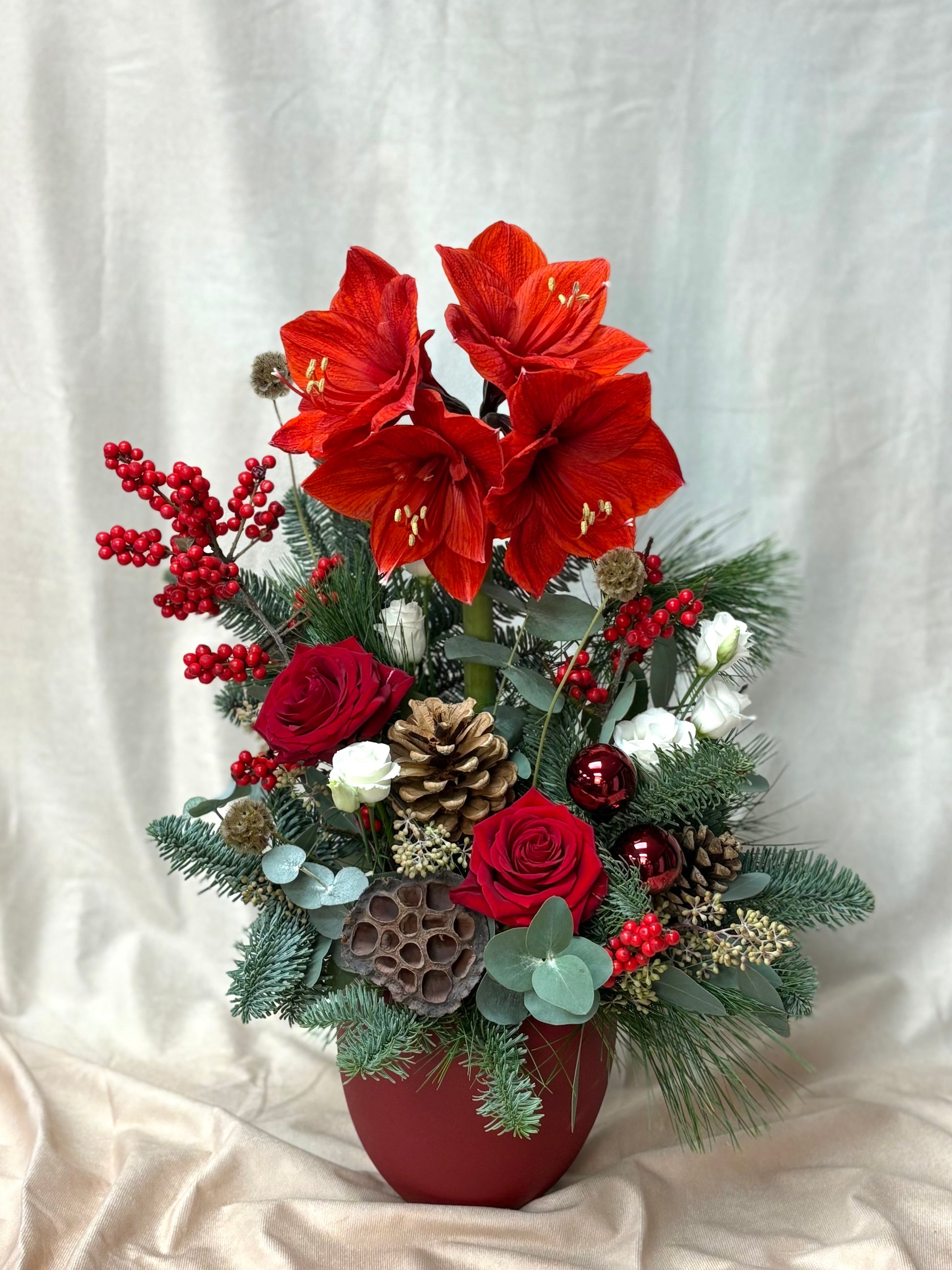 A luxurious long-lasting arrangement in a red container. Including a towering red Amaryllis, ilex berries, lisianthus and sumptuous red roses on a bed of fragrant blue spruce, pinus, eucalyptus, baubles and adornments such as pine cones and lotus heads.