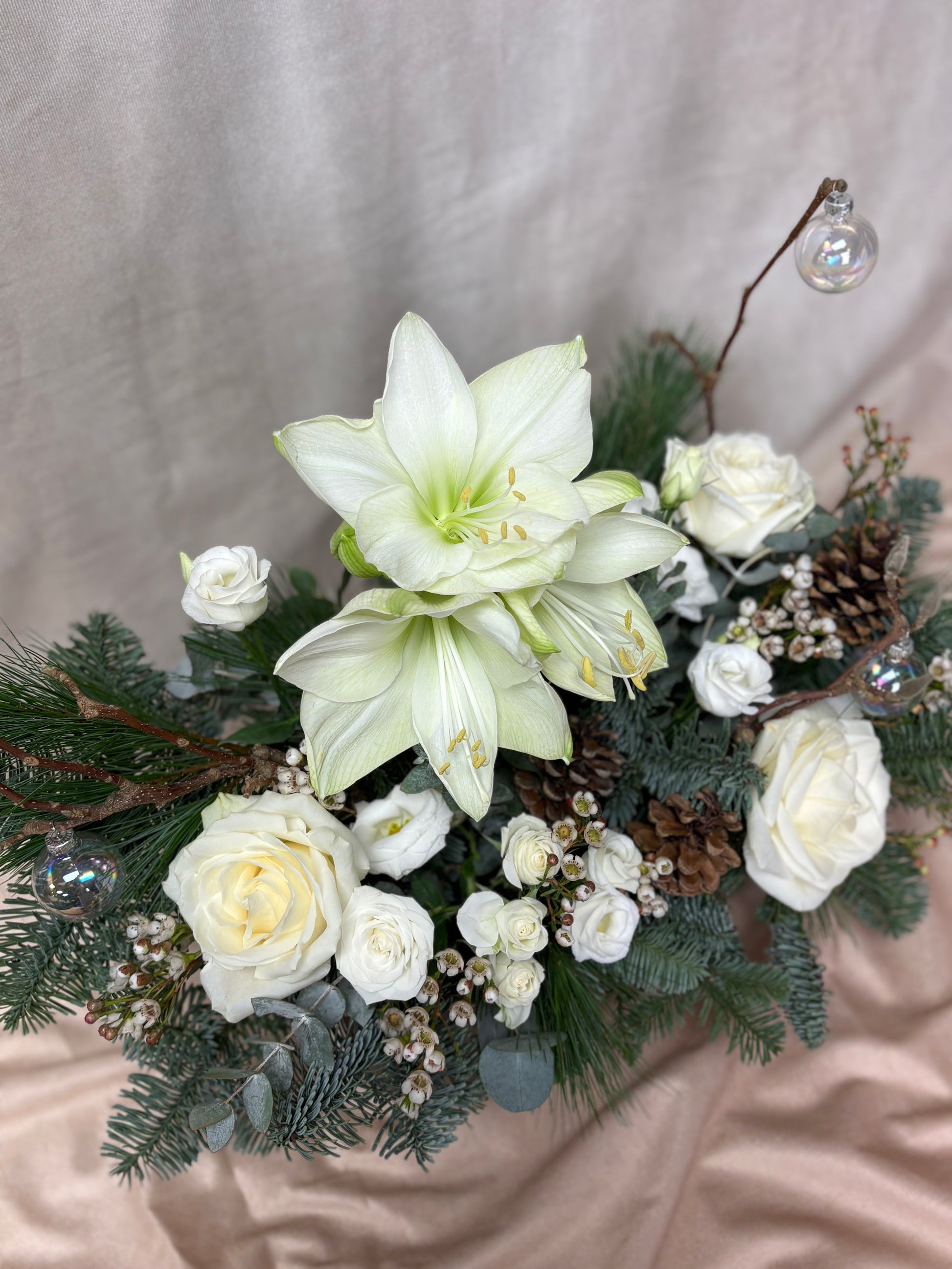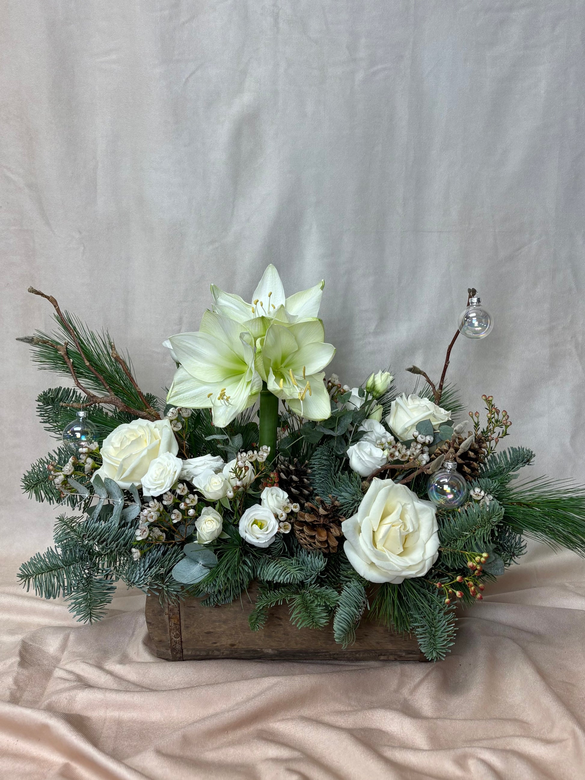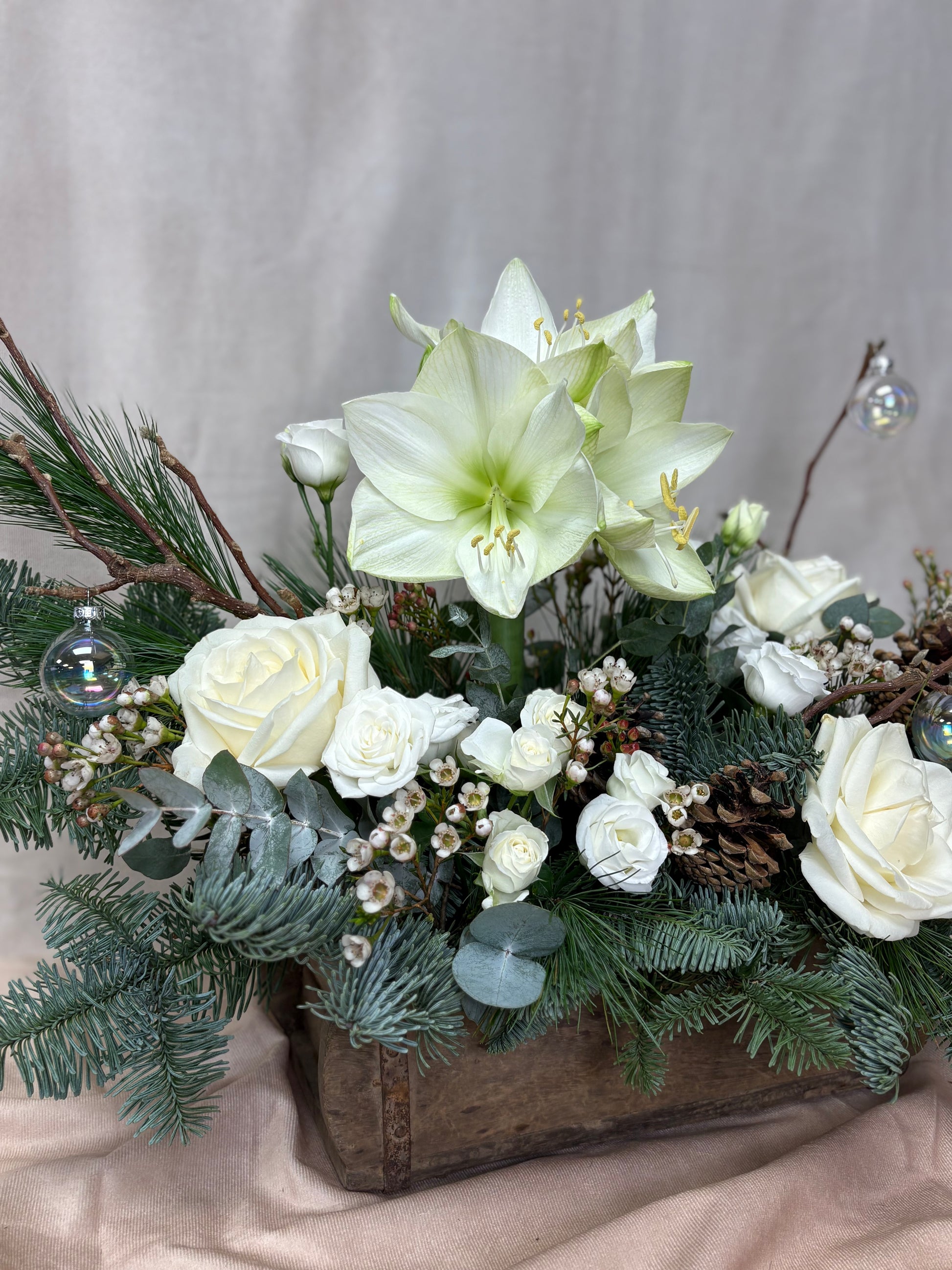 A rustic winter arrangement in a wooden container including a stunning amaryllis, avalanche roses, lisianthus spray roses, magnolia twigs and seasonal filler flowers atop natural adornments, fragrant blue spruce, pinus and eucalyptus.