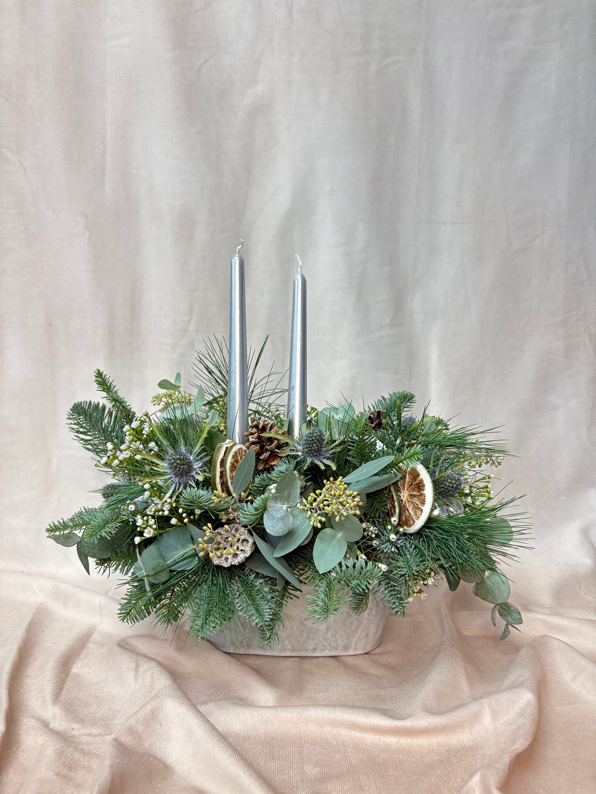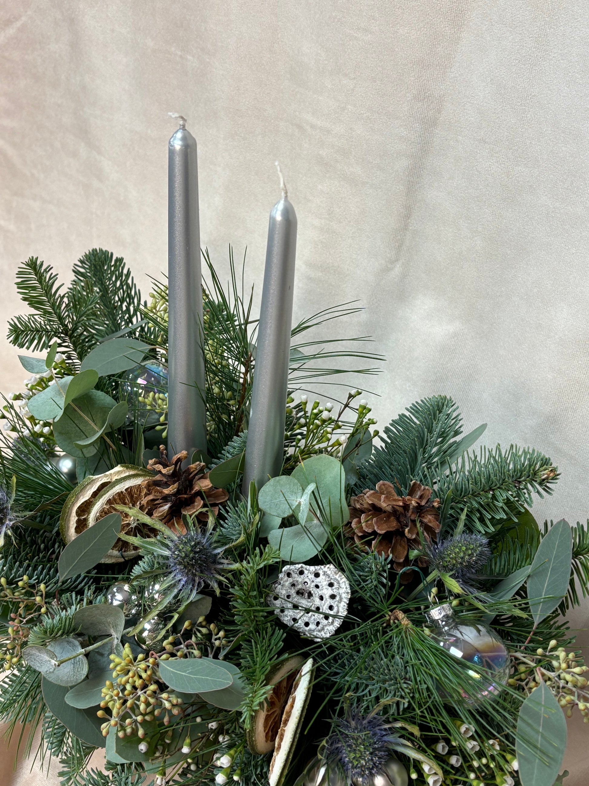 A long-lasting silver candle arrangement including fragrant blue spruce, pinus, eucalyptus, berried populous, thistles, seasonal filler flowers and adornments such as baubles, dried citrus, pine cones and lotus heads in a gorgeous white ironstone glazed oval container.